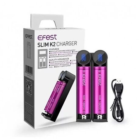 Φορτίστε την μπαταρία σας με τον Efest Slim K2, ένα φορτιστή υψηλής ποιότητας, χαμηλού κόστους και μικρού μεγέθους. Δέχεται δυο μπαταρίες και φορτίζει μέσω καλωδίου Micro USB στα 1A. Κάθε θέση παρακολουθείται αυτόνομα ώστε να γίνεται η πιο αποδοτική φόρτιση. Το LED δείχνει πότε η μπαταρία φορτίζει και πότε είναι έτοιμη. Ο φορτιστής έχει αντίστροφη πολικότητα, προστασία βραχυκυκλώματος και υπερφόρτισης και πολλά άλλα χαρακτηριστικά ασφαλείας. Μπορεί να φορτίσει διαφορετικούς τύπους 3.6V/3.7V μπαταριών λιθίου.